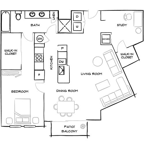 This upgraded 1-bedroom, 1-bathroom floor plan features an open-concept layout with a corner kitchen.